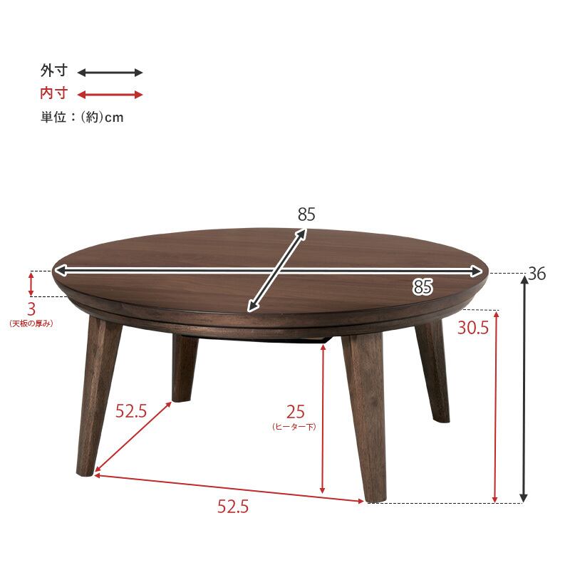 オールシーズンお使いいただけるデザインの丸型こたつテーブルです。